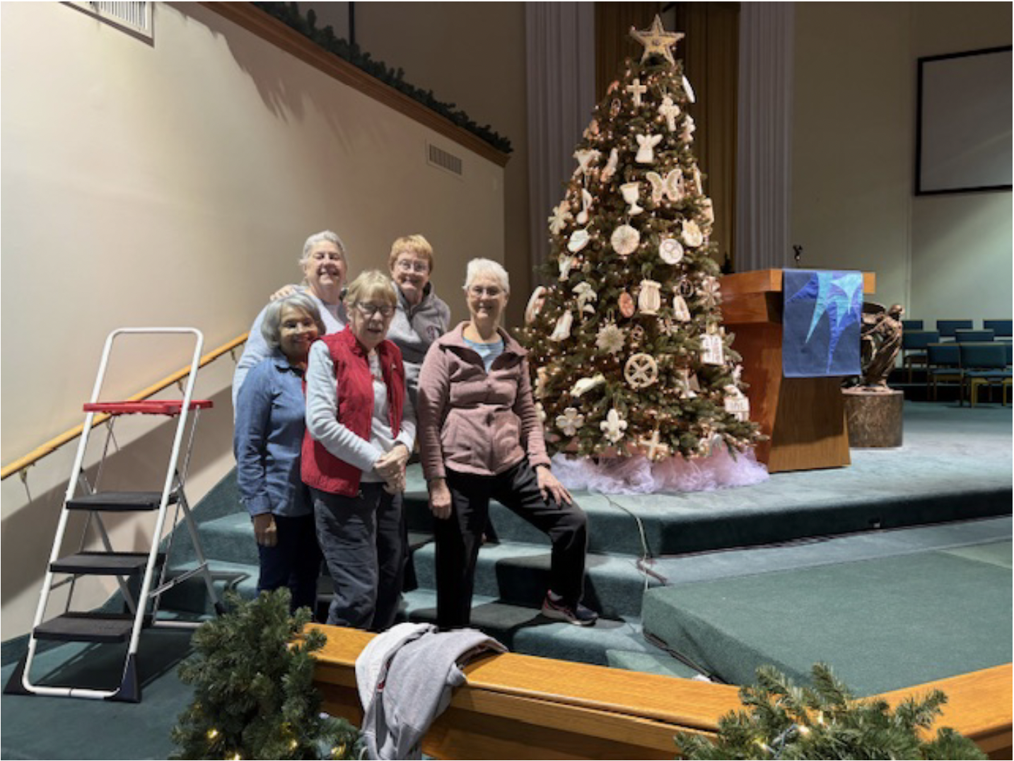 On January 10, 1969, Stonybrook Women’s Society of Christian Service (WSCS), one of the groups that formed United Methodist Women in the early 1970s and is now called United Women in Faith, was granted permission to use the patterns developed by Francis K. Spencer of the Lutheran Church of the Ascension in Danville, VA. She designed the Chrismons from Christian symbols of Monograms used by early Christians. The Lutheran Church of the Ascension owns the trademark and copyrights for the Chrismons. Chrismon is a combination of parts of two words, Christ and Monogram. Each Chrismon has a symbolic meaning. The Chrismon ornaments that you see on the Chrismon Tree were handmade by Stonybrook WSCS.